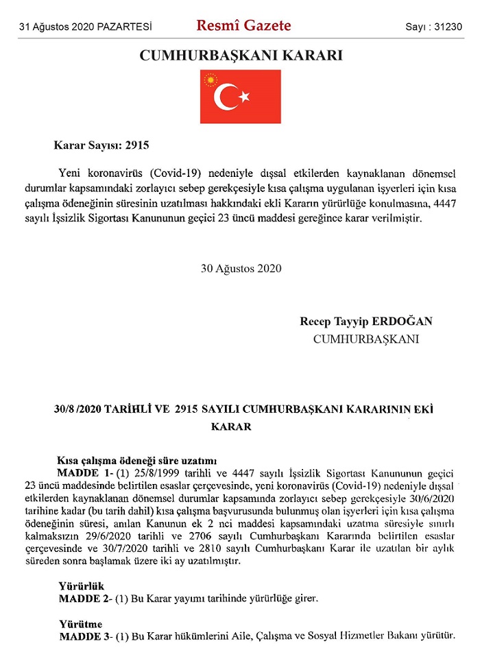 Yeni Koronavirüs (Kovid-19) Nedeniyle Dışsal Etkilerden Kaynaklanan Dönemsel Durumlar Kapsamındaki Zorlayıcı Sebep Gerekçesiyle Kısa Çalışma Uygulanan İşyerleri İçin Kısa Çalışma Ödeneğinin Süresinin Uzatılması Hakkındaki Cumhurbaşkanı Kararı, Resmi Gazete’nin 31 Ağustos 2020 Pazartesi sayısında yayımlandı. Böylece, karar ile kısa çalışma uygulanan işyerleri için uygulama 31 Ekim 2020 tarihine kadar devam edecek.