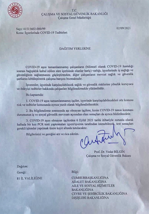 Çalışma ve Sosyal Güvenlik Bakanlığı tarafından 2 Eylül 2021 tarihinde 81 ilin Valiliği’ne bir genelge gönderildi. Covid-19 aşısı olmayan işçilerden, işverenlerin gerekli görmeleri halinde zorunlu olarak haftada bir kez PCR testi isteyebileceği açıklandı. Genelgede aşısız olarak çalışmanın işçi sağlığı ve iş güvenliği konusunda yaratacağı risk ve tehlikelere dikkat çekildi.
