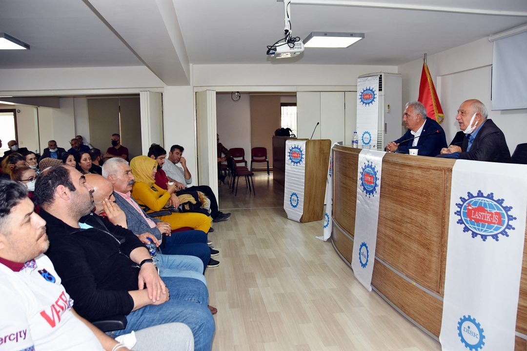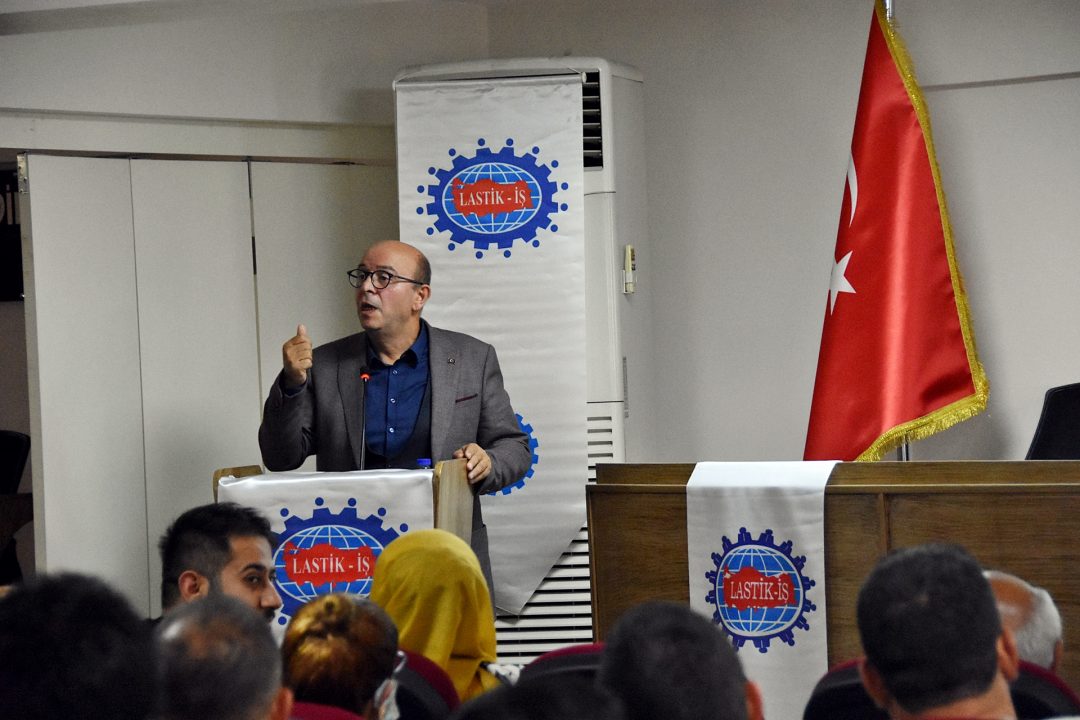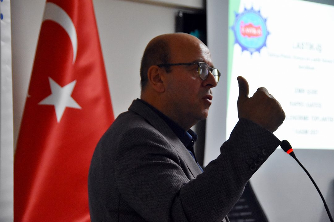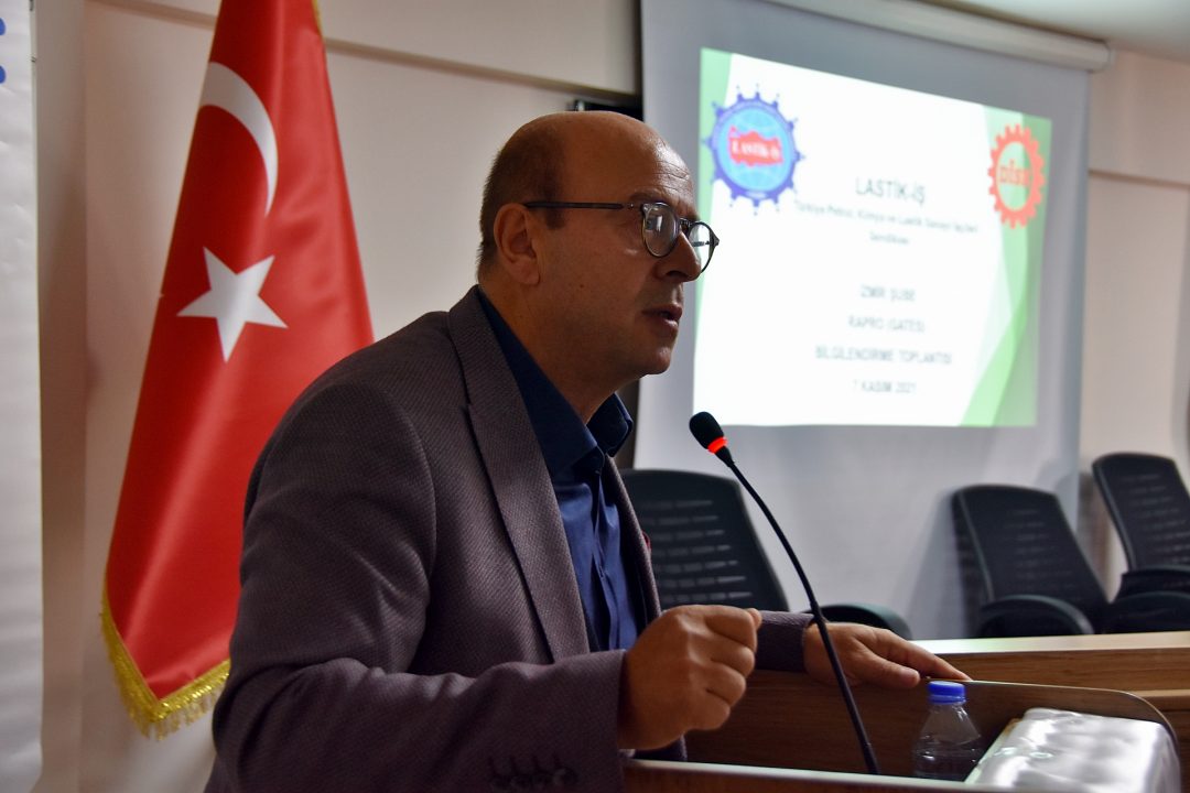 İzmir Şube Başkanımız Yusuf Ziya Sarı’nın toplantıyı başlatmasının ardından ‘’Geçmişten Geleceğe Lastik-İş’’ ve Gates emekçilerine özel hazırlanmış bir sinevizyon gösterimi yapıldı. Ardından Genel Başkanımız Alaaddin Sarı konuşma yaptı.