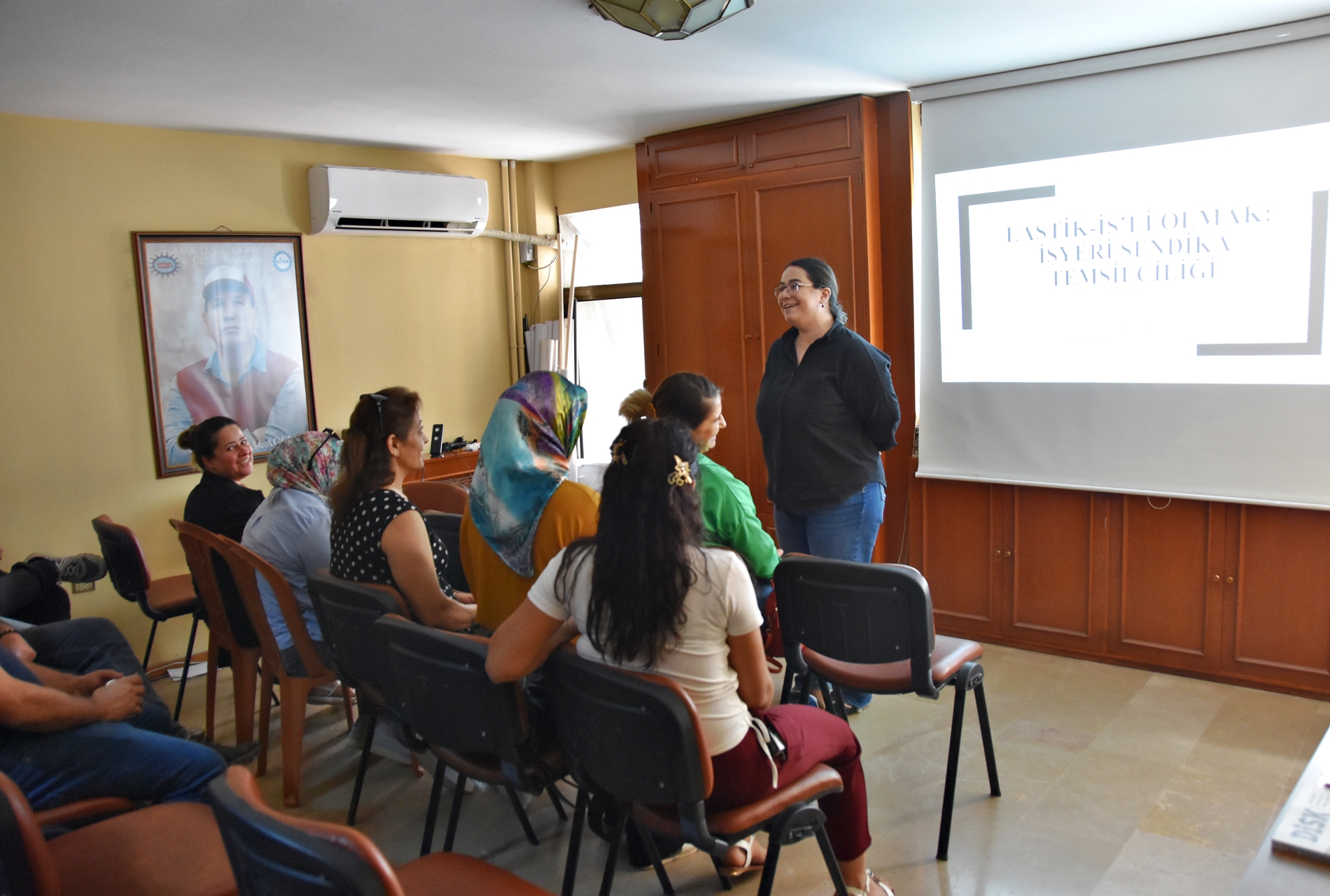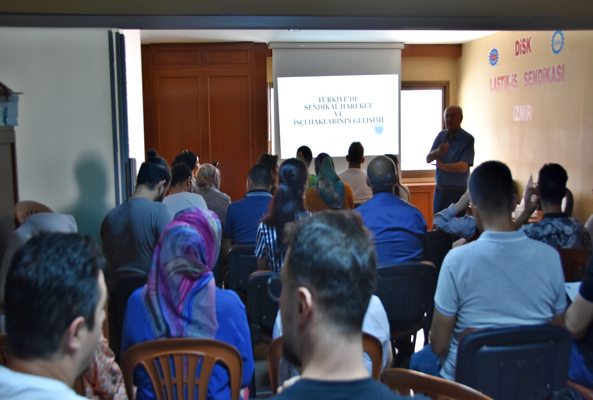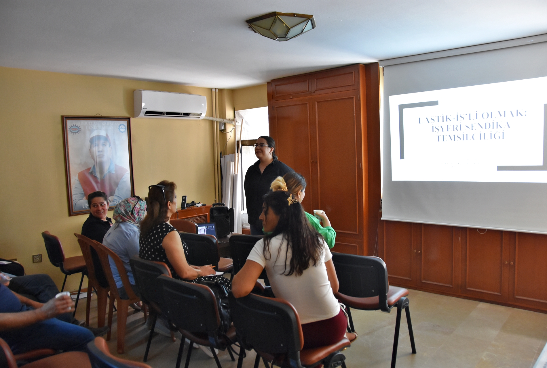 Sendikamızın eğitim çalışmaları kapsamında 11 Haziran 2023 tarihinde Rapro Kimya Turizm Bilişim San. ve Tic. A.Ş., Etap Enjeksiyon Plastik San. ve Tic. A.Ş., Aktiv Akril Akrilik Mamül Banyo Jakuzi San. Tic. Ltd. Şti., Rultrans Transmisyon Sanayi ve Ticaret A.Ş. ve Aero Rüzgar Endüstrisi A.Ş.’de çalışan üyelerimiz ile temsilci aday eğitimi gerçekleştirdik. Lastik-İş Sendikası İzmir Şubesi’nde gerçekleşen eğitime; sendikamızın Eğitim Basın Yayın Dairesi Başkanı Salih Gür, Toplu Sözleşme ve Eğitim Dairesi Müdürü Üzeyir Ataman, Toplu Sözleşme Dairesi Uzmanı Ece Göktürk, sendikamızın avukatı Tolga Demirel, Lastik-İş Sendikası İzmir Şube yöneticilerimiz, temsilcilerimiz ve işyerlerinden seçimlerde temsilci adayı olmayı düşünen üyelerimiz katıldı. Eğitim Lastik-İş belgeselinin gösterimi ile başladı.