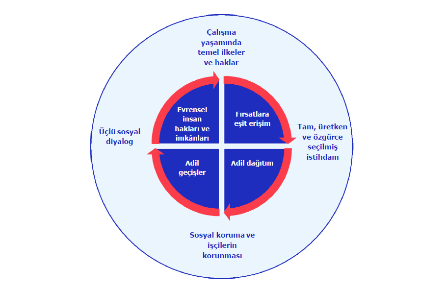 - Tüm insanların özgür ve onurlu bir şekilde çalışabileceği, ekonomik güvenlik sunan ve başarılı olmalarını sağlayan tam, üretken ve özgürce seçilmiş istihdam fırsatlarına eşit olarak erişebileceği, üretkenlik çabaları ve toplumsal katkıları için adil bir pay alabilecekleri ve yaşamları boyunca adil geçişleri deneyimleyebilecekleri koşulları yaratmak için hem kamusal hem de özel sürekli ve uyumlu eylemler esastır.