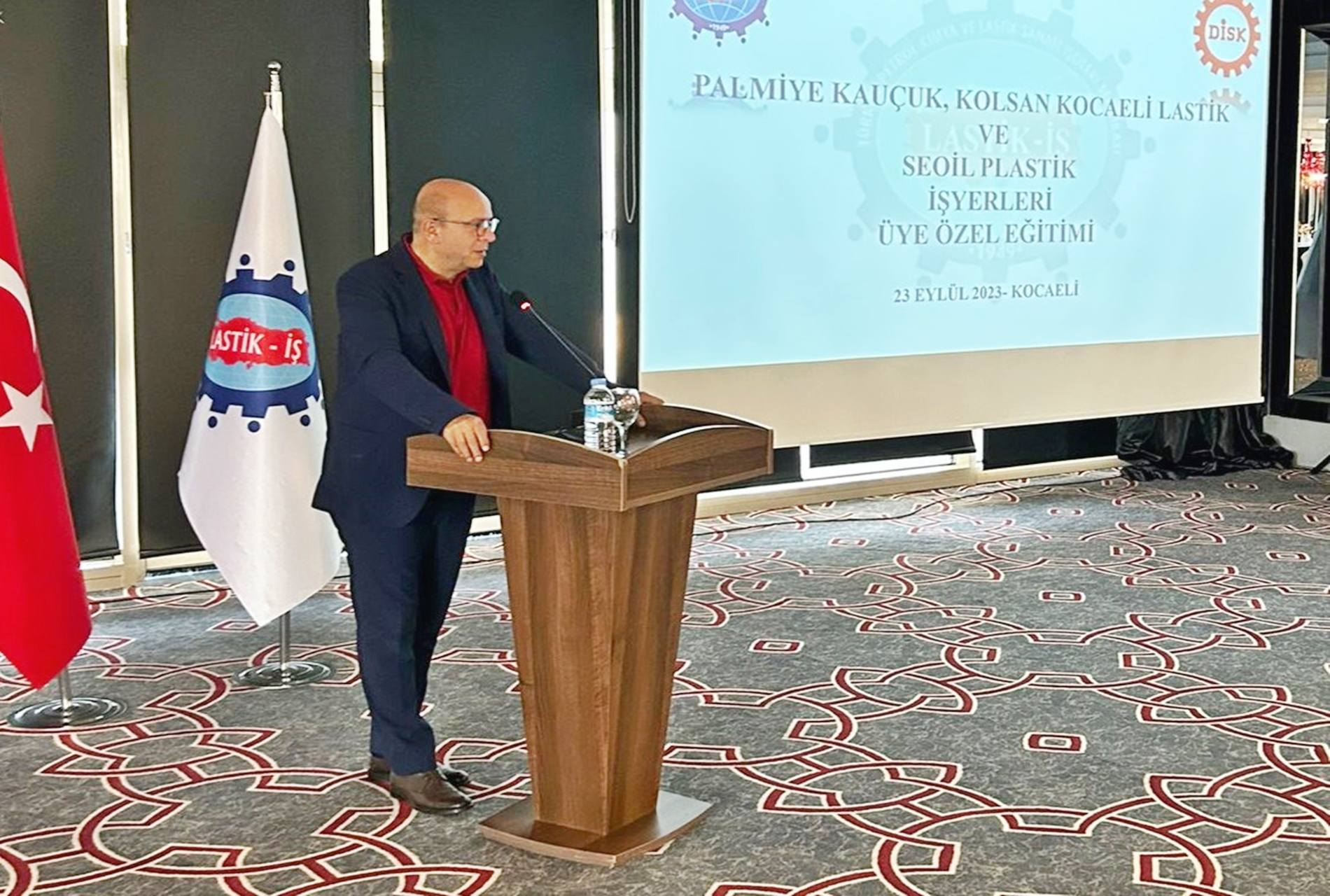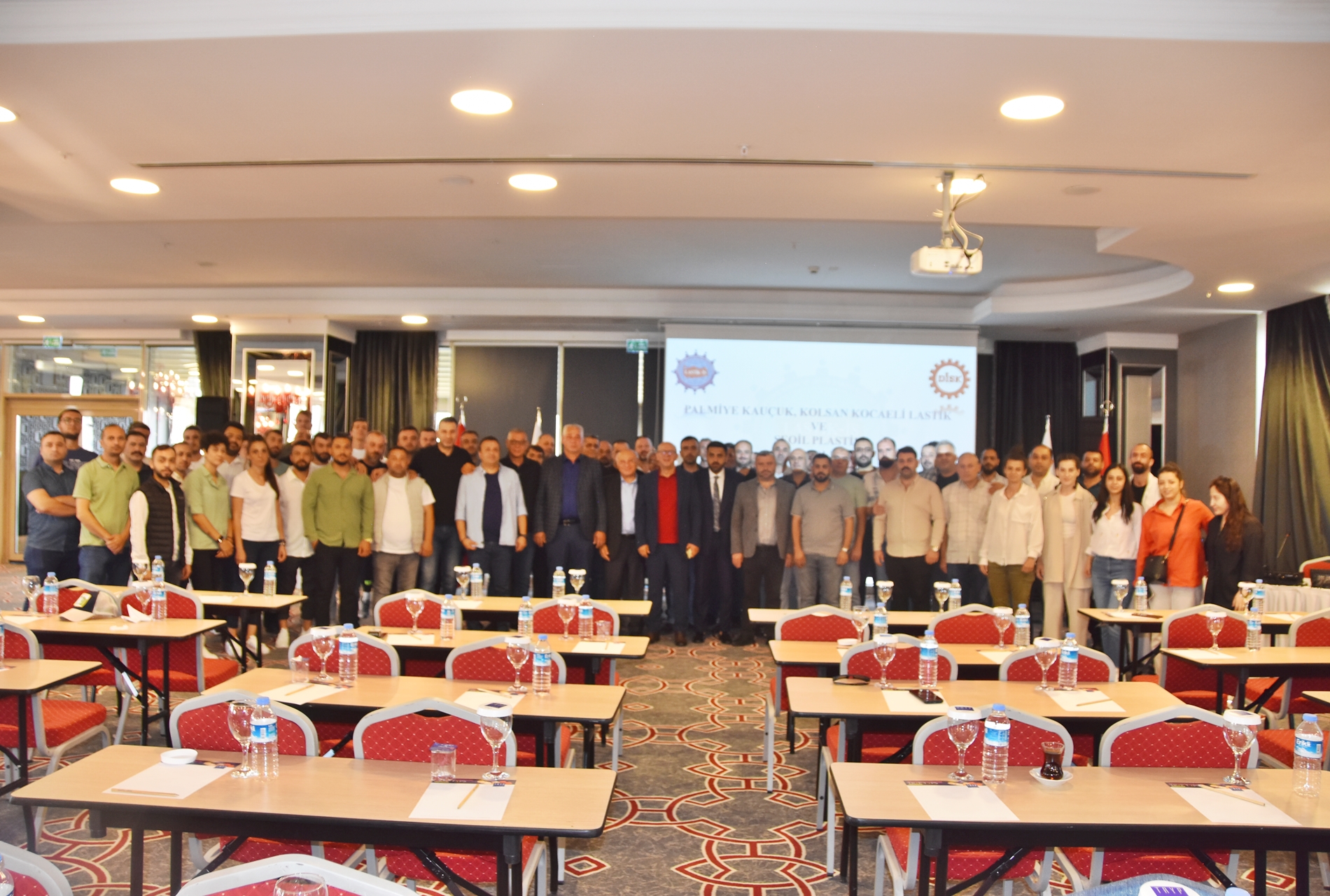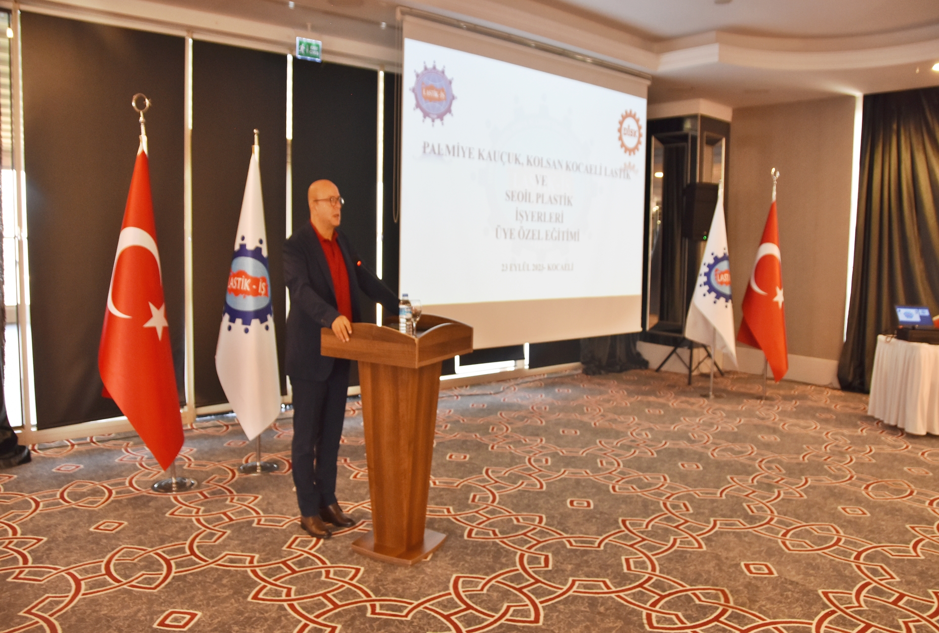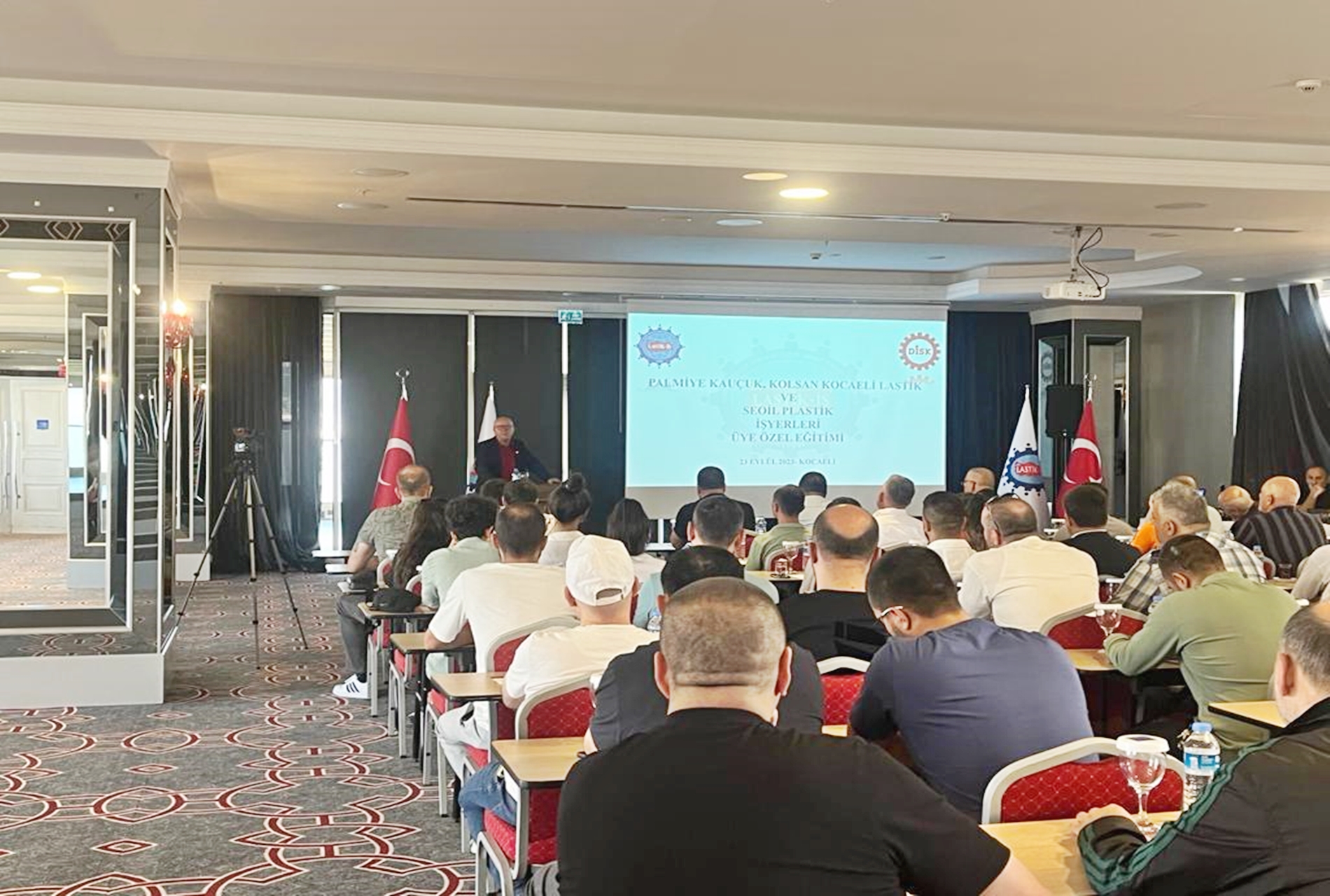 Sendikamızın eğitim çalışmaları kapsamında 23 Eylül 2023 tarihinde Seoil Plastik, Kolsan Kocaeli Lastik ve Palmiye Kauçuk işyerlerinde Üye Özel Eğitimi gerçekleştirdik. TRYP By Wyndham’da gerçekleşen eğitime; Sendikamızın Genel Başkanı Alaaddin Sarı, Eğitim Basın Yayın Dairesi Başkanı Salih Gür, Mali İşler Dairesi Başkanı Nejdet Ulusoy, Örgütlenme Dairesi Başkanı Alperen Şakacı, Toplu Sözleşme ve Eğitim Dairesi Müdürü Üzeyir Ataman, Toplu İş Sözleşmesi Dairesi Uzmanı Ece Göktürk, sendikamızın avukatı Tolga Demirel, Lastik-İş Sendikası Kocaeli Şube yöneticileri ve işyerlerinden üyelerimiz katıldı. Eğitim Genel Başkanımız Alaaddin Sarı’nın konuşması ile başladı.