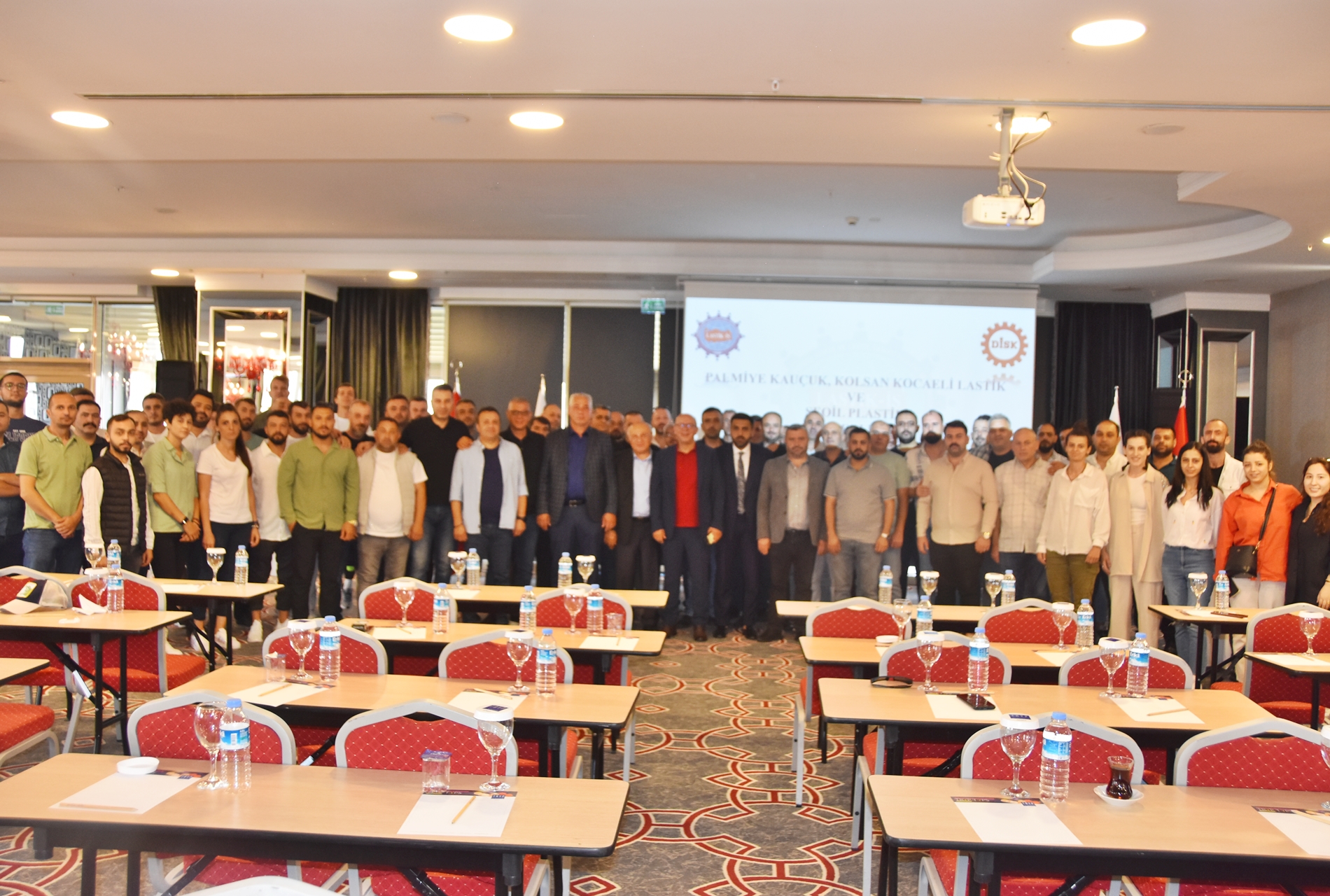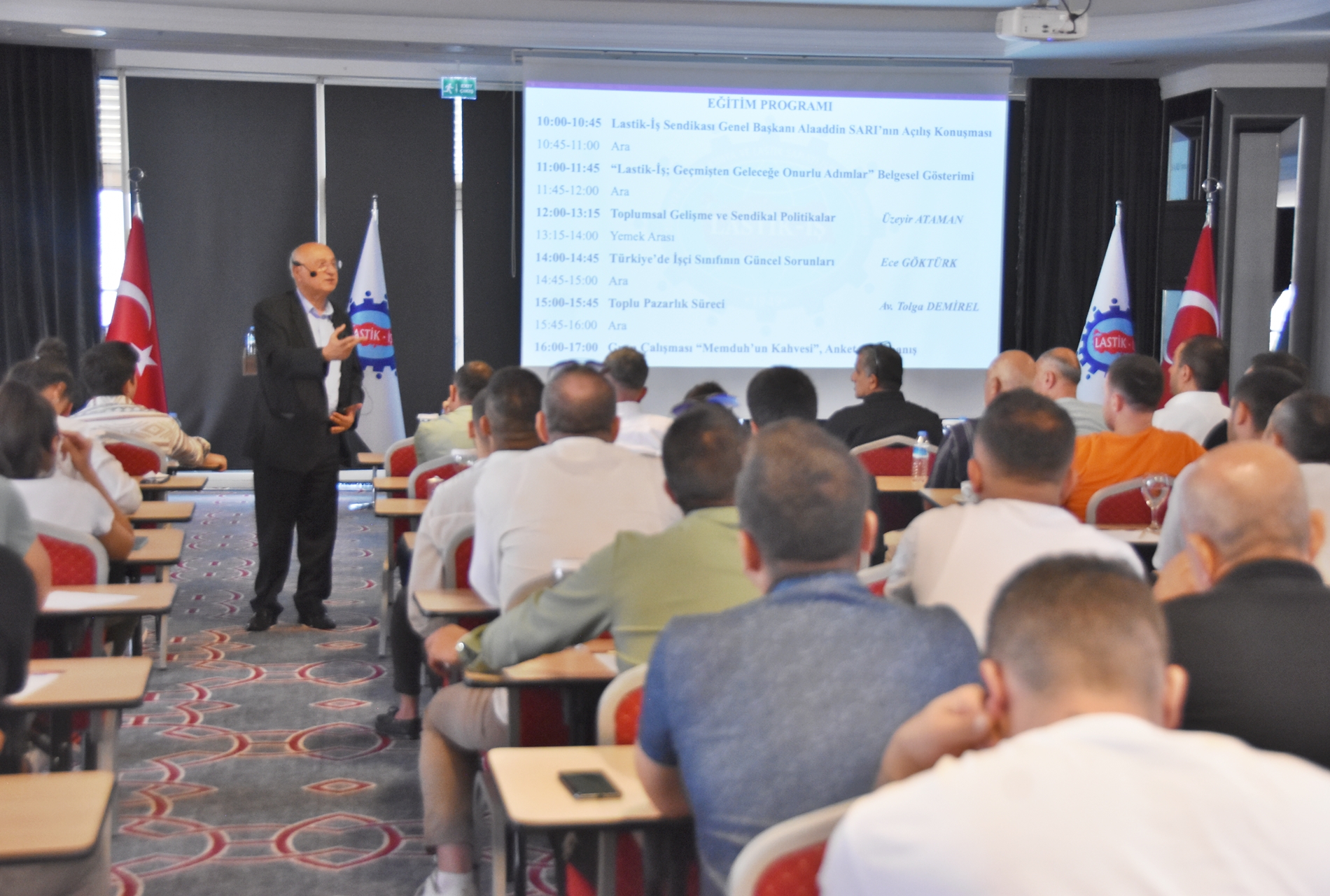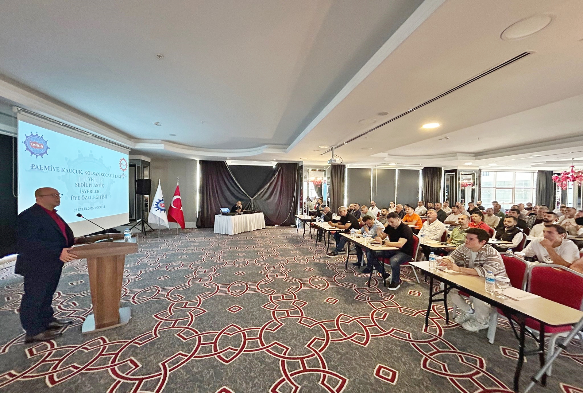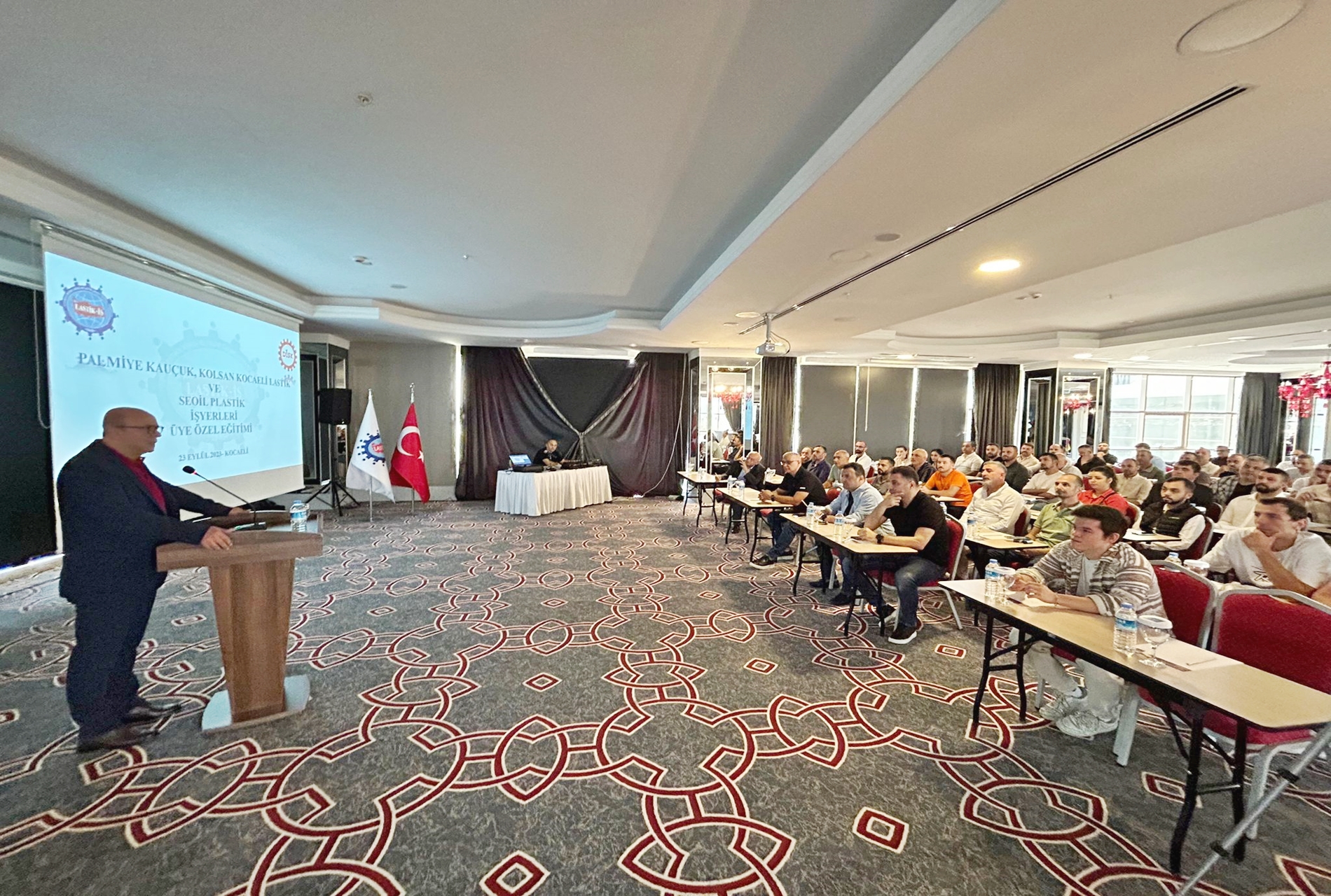 Sendikamızın eğitim çalışmaları kapsamında 23 Eylül 2023 tarihinde Seoil Plastik, Kolsan Kocaeli Lastik ve Palmiye Kauçuk işyerlerinde Üye Özel Eğitimi gerçekleştirdik. TRYP By Wyndham’da gerçekleşen eğitime; Sendikamızın Genel Başkanı Alaaddin Sarı, Eğitim Basın Yayın Dairesi Başkanı Salih Gür, Mali İşler Dairesi Başkanı Nejdet Ulusoy, Örgütlenme Dairesi Başkanı Alperen Şakacı, Toplu Sözleşme ve Eğitim Dairesi Müdürü Üzeyir Ataman, Toplu İş Sözleşmesi Dairesi Uzmanı Ece Göktürk, sendikamızın avukatı Tolga Demirel, Lastik-İş Sendikası Kocaeli Şube yöneticileri ve işyerlerinden üyelerimiz katıldı. Eğitim Genel Başkanımız Alaaddin Sarı’nın konuşması ile başladı.