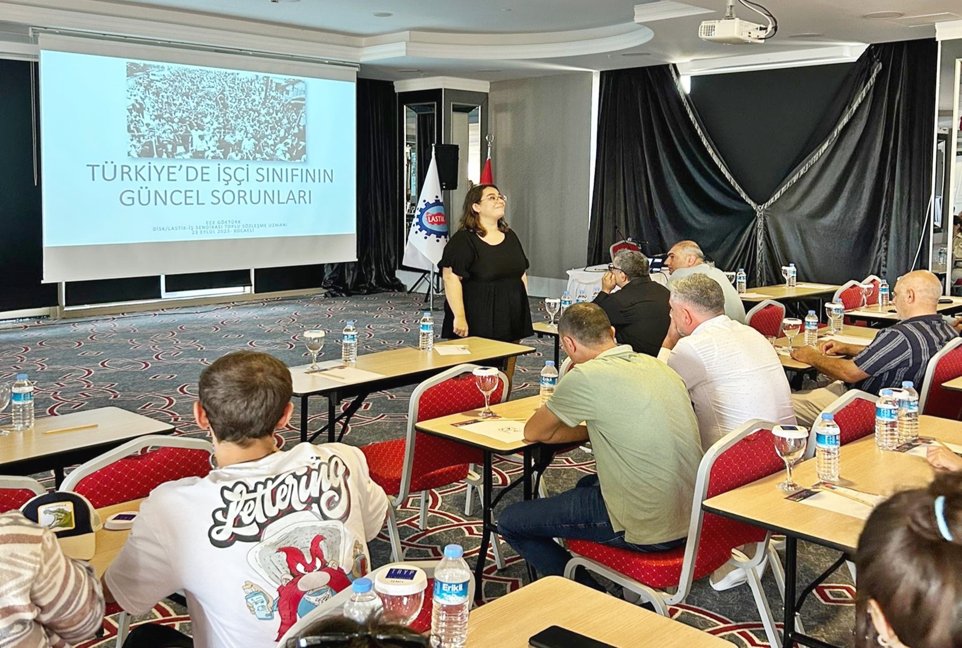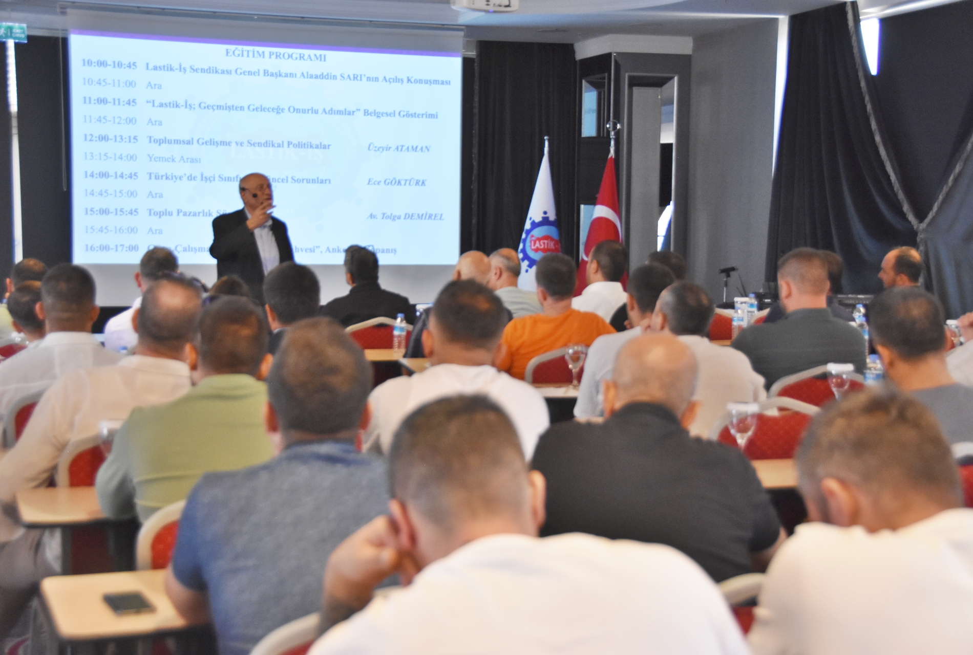 Program ‘’Lastik-İş Geçmişten Geleceğe Onurlu Adımlar’’ belgeselinin gösterimi ile devam etti. Sendikamızın Toplu Sözleşme ve Eğitim Dairesi Müdürü Üzeyir Ataman ‘Toplumsal Gelişme ve Sendikal Politikalar’’ adlı sunumunu işledi. Toplu İş Sözleşmesi Dairesi Uzmanımız Ece Göktürk’ün ‘’Türkiye’de İşçi Sınıfının Güncel Sorunları’’ sunumunun ardından Sendikamızın Avukatı Tolga Demirel “Toplu Pazarlık Süreci” adlı sunumunu yaptı. Eğitim sunumların ardından yapılan anket uygulaması ile son buldu.