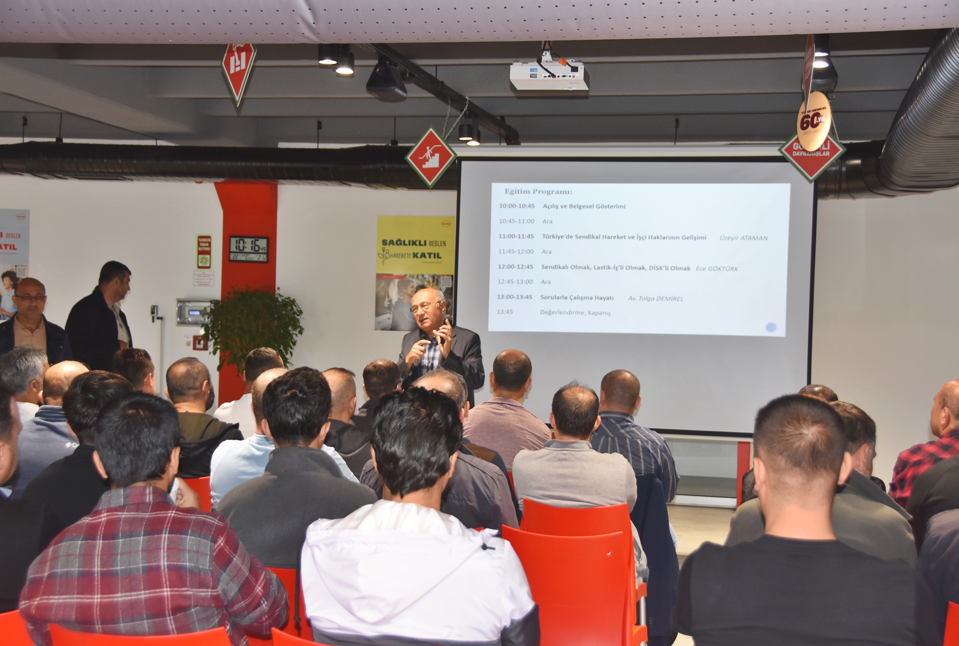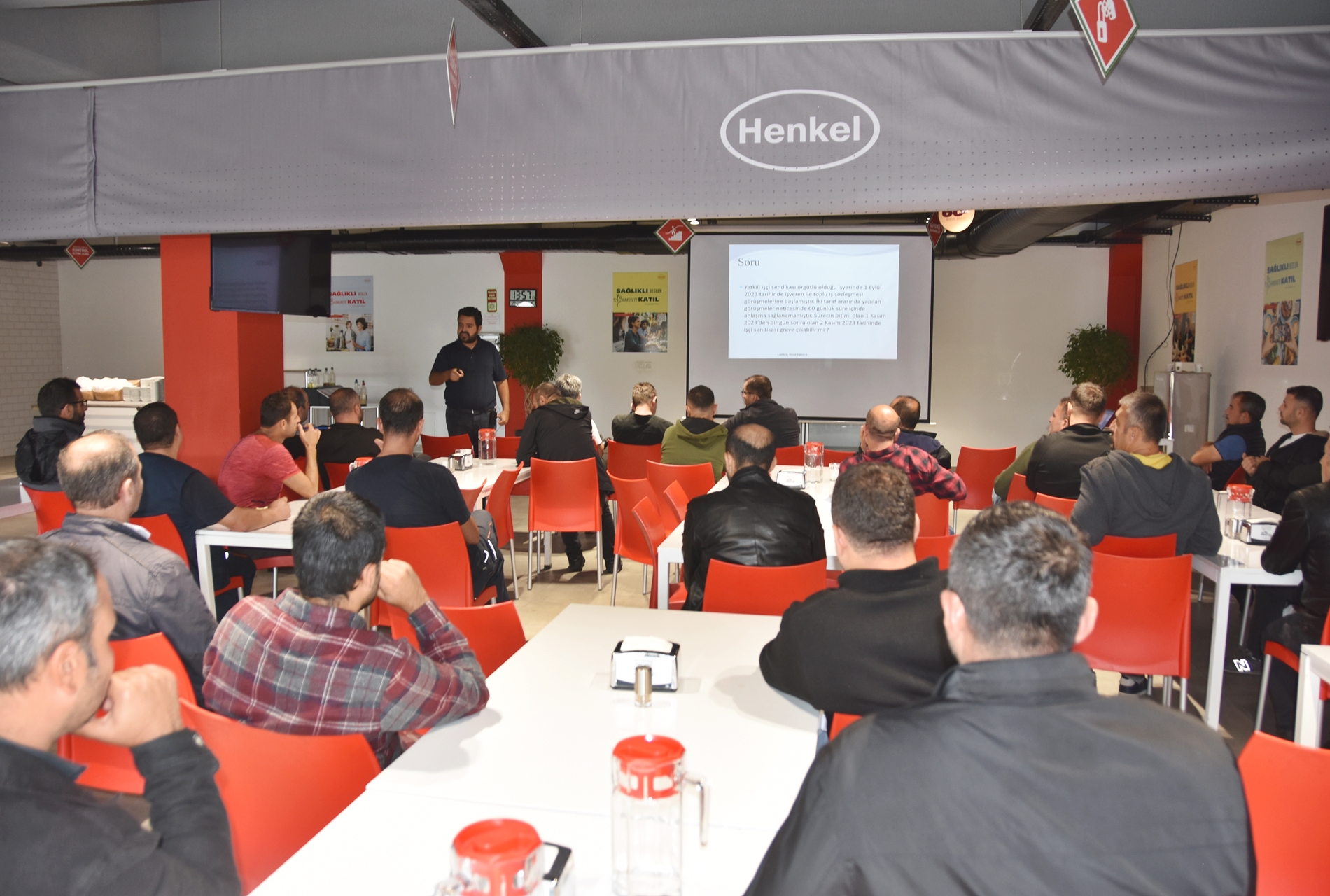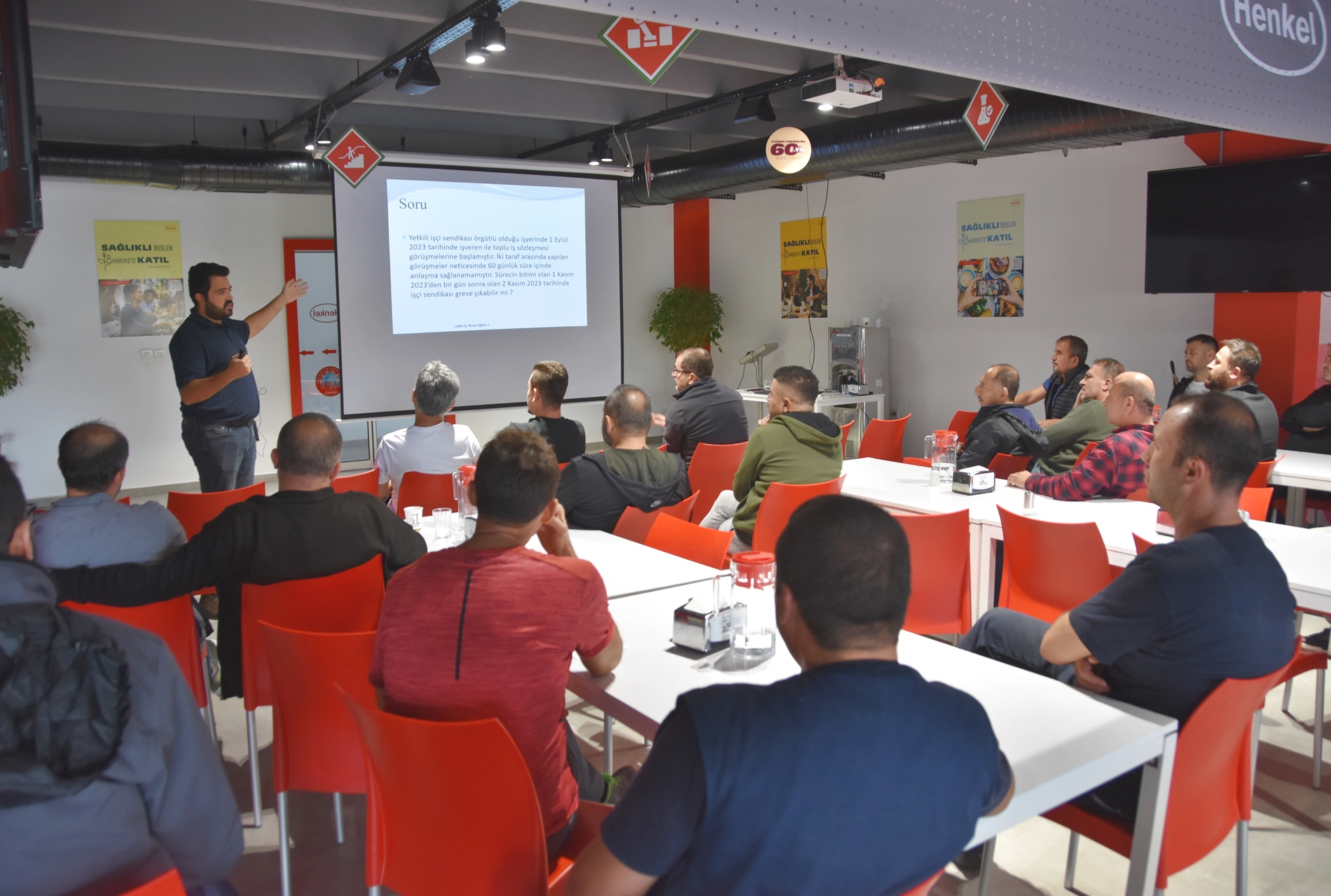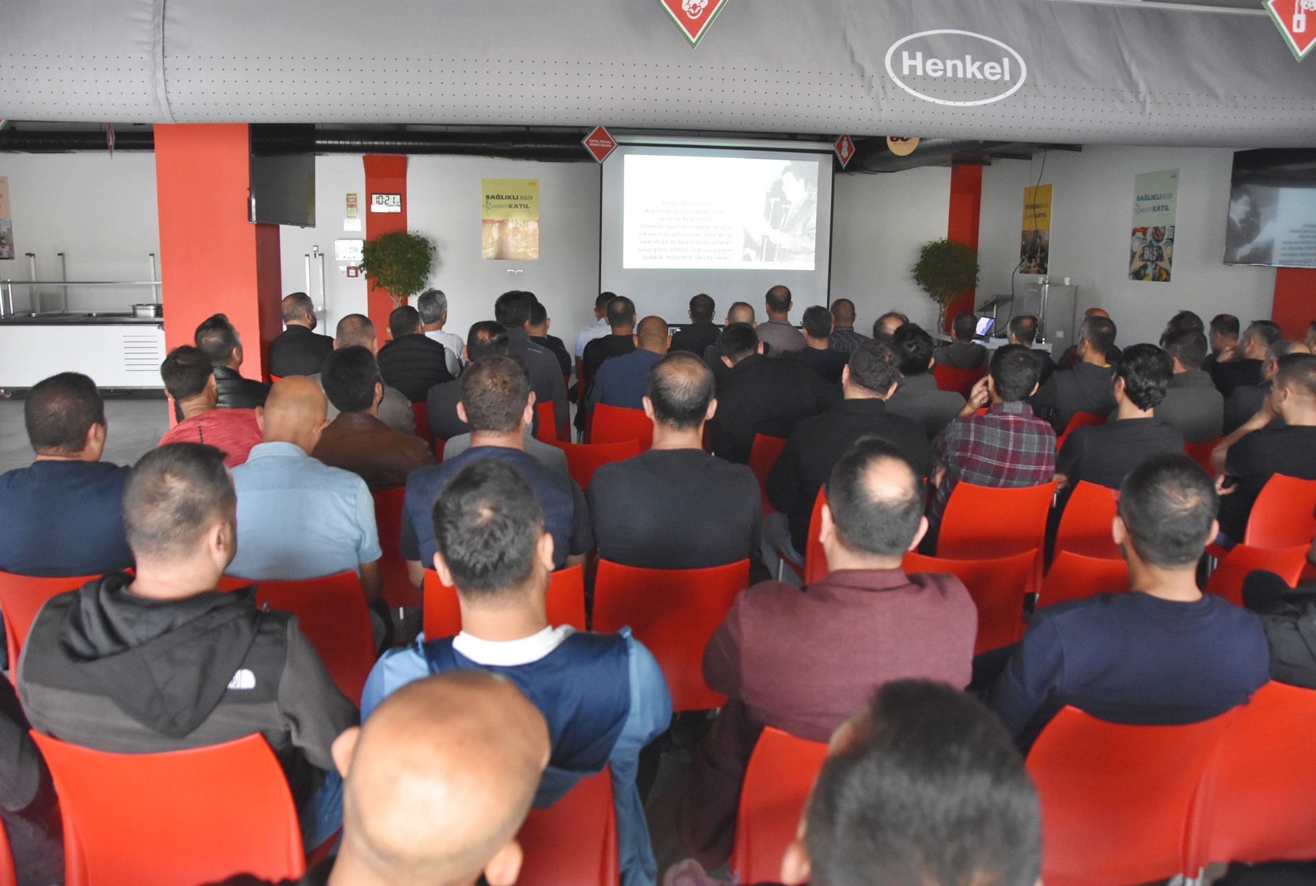 Sendikamızın 2023-2024 yılı eğitim çalışmaları kapsamında 1 Ekim 2023 Pazar günü Ankara’da kurulu Türk Henkel Kimya San. ve Tic. A.Ş.’de çalışan üyelerimizle Üye Özel Eğitimi gerçekleştirdik. İşyerinde gerçekleşen eğitime; Toplu Sözleşme ve Eğitim Dairesi Müdürü Üzeyir Ataman, Toplu İş Sözleşmesi Dairesi Uzmanı Ece Göktürk, Eğitim Basın Yayın Dairesi Uzmanı Eda Aligöz, sendikamızın avukatı Tolga Demirel, Lastik-İş Sendikası Gebze Şube Başkanı Özay Bektaş, Şube İdari Sekreteri Şener Uçar, işyerlerinden temsilci ve üyelerimiz katıldı. Eğitim ‘’Lastik-İş Geçmişten Geleceğe Onurlu Adımlar’’ belgeselinin gösterimi ile başladı.