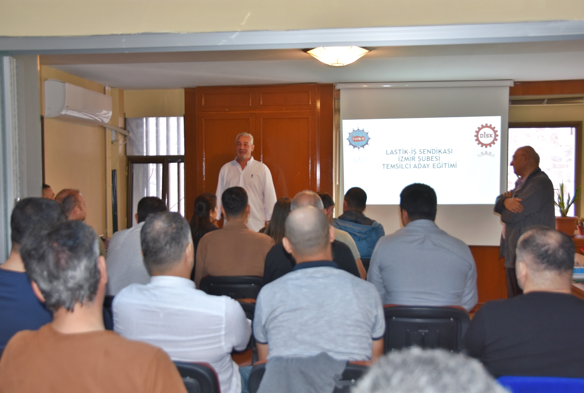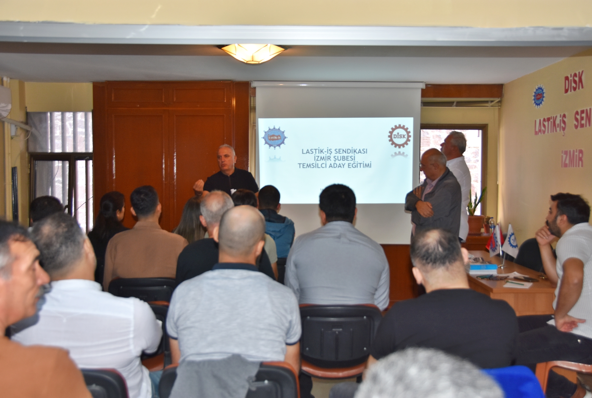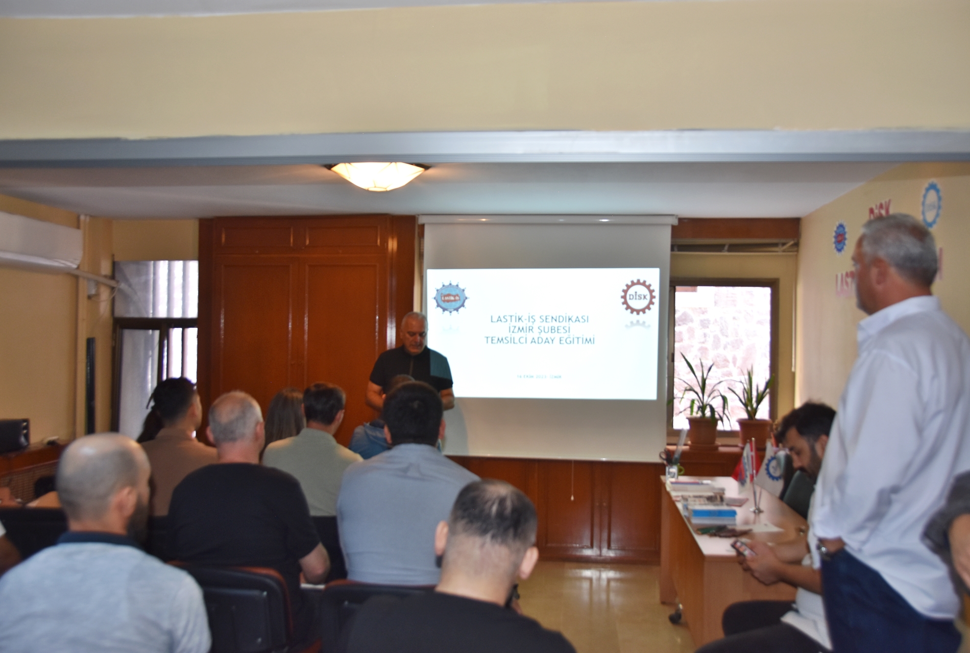Sendikamızın 2023-2024 yılı eğitim çalışmaları kapsamında 16 Ekim 2023 Pazartesi günü Japar, LM Wind, Etap, Akdeniz Chemson, Aktiv Akril işyerlerinde çalışan üyelerimiz ile temsilci aday eğitiminin birinci aşamasını 2. grup ile gerçekleştirdik. Lastik-İş Sendikası İzmir Şubesi’nde gerçekleşen eğitime; sendikamızın Eğitim Basın Yayın Dairesi Başkanı Salih Gür, Toplu Sözleşme ve Eğitim Dairesi Müdürü Üzeyir Ataman, Toplu Sözleşme Dairesi Uzmanı Ece Göktürk, sendikamızın avukatı Tolga Demirel, İzmir Şube Başkanı Yusuf Ziya Sarı ve yönetimi, temsilcilerimiz ve işyerlerinden seçimlerde temsilci adayı olmayı düşünen üyelerimiz katıldı. Eğitim ‘’Lastik-İş Geçmişten Geleceğe Onurlu Adımlar’’ belgeseli gösterimi ile başladı.