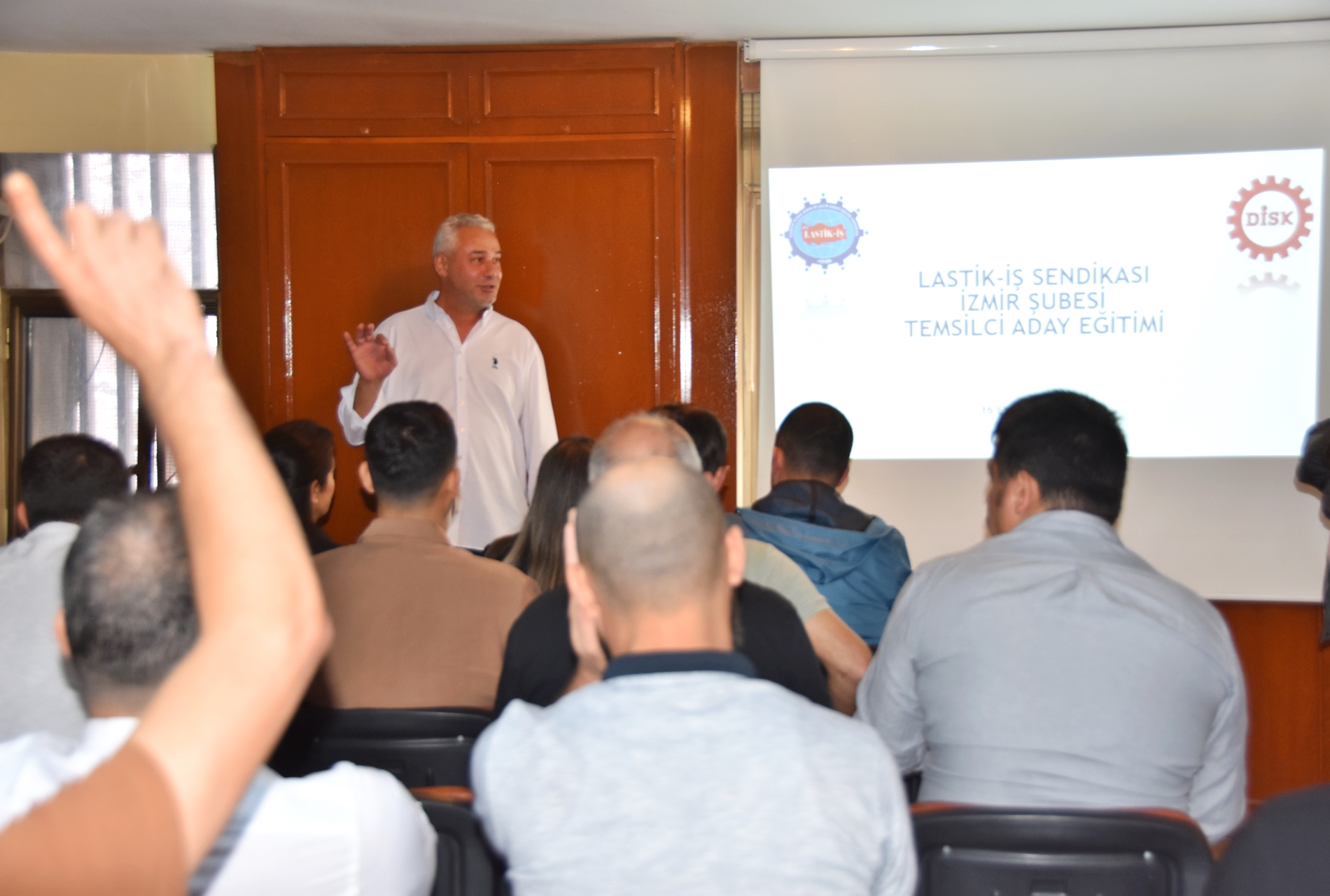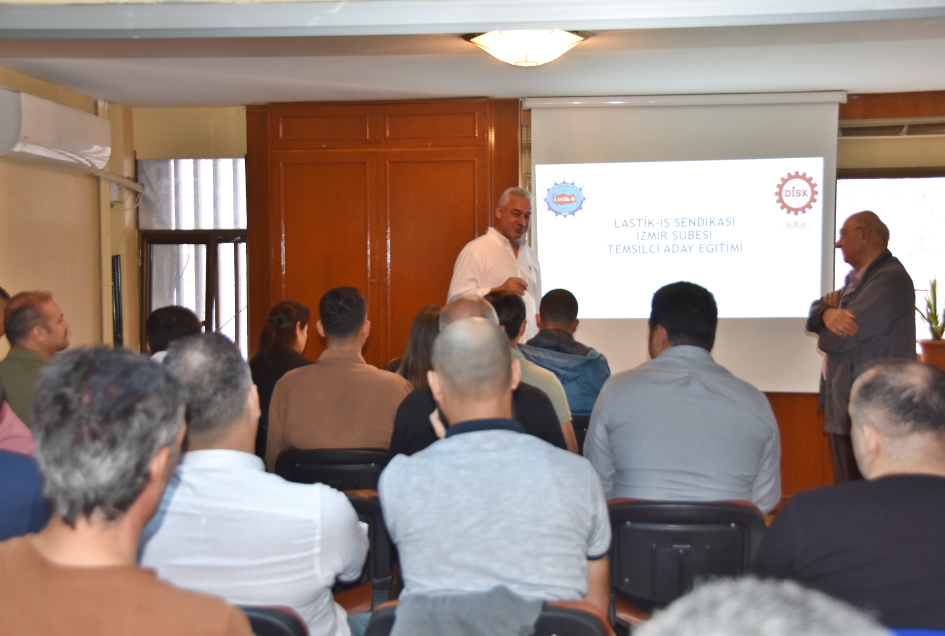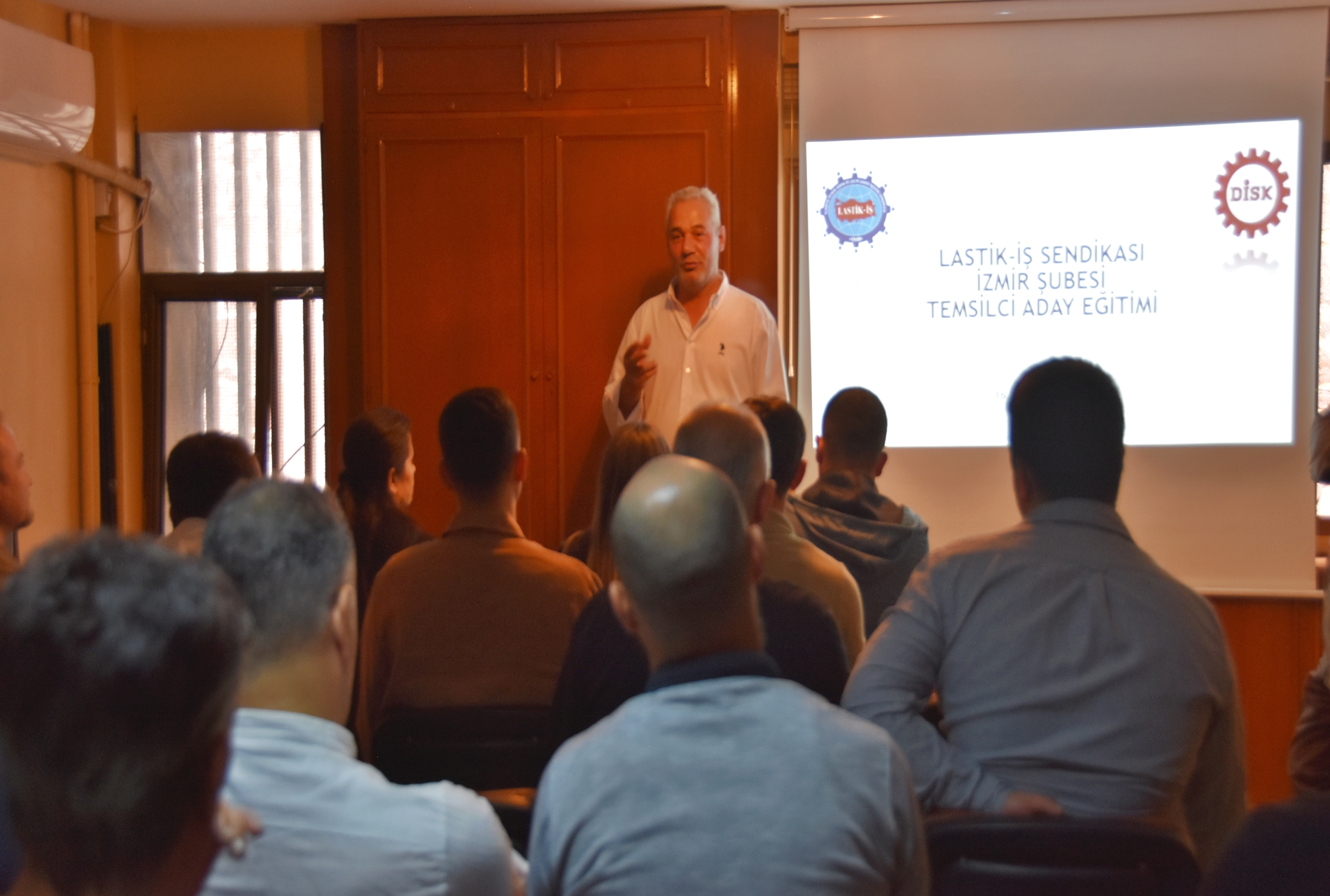 Sendikamızın 2023-2024 yılı eğitim çalışmaları kapsamında 16 Ekim 2023 Pazartesi günü Japar, LM Wind, Etap, Akdeniz Chemson, Aktiv Akril işyerlerinde çalışan üyelerimiz ile temsilci aday eğitiminin birinci aşamasını 2. grup ile gerçekleştirdik. Lastik-İş Sendikası İzmir Şubesi’nde gerçekleşen eğitime; sendikamızın Eğitim Basın Yayın Dairesi Başkanı Salih Gür, Toplu Sözleşme ve Eğitim Dairesi Müdürü Üzeyir Ataman, Toplu Sözleşme Dairesi Uzmanı Ece Göktürk, sendikamızın avukatı Tolga Demirel, İzmir Şube Başkanı Yusuf Ziya Sarı ve yönetimi, temsilcilerimiz ve işyerlerinden seçimlerde temsilci adayı olmayı düşünen üyelerimiz katıldı. Eğitim ‘’Lastik-İş Geçmişten Geleceğe Onurlu Adımlar’’ belgeseli gösterimi ile başladı.