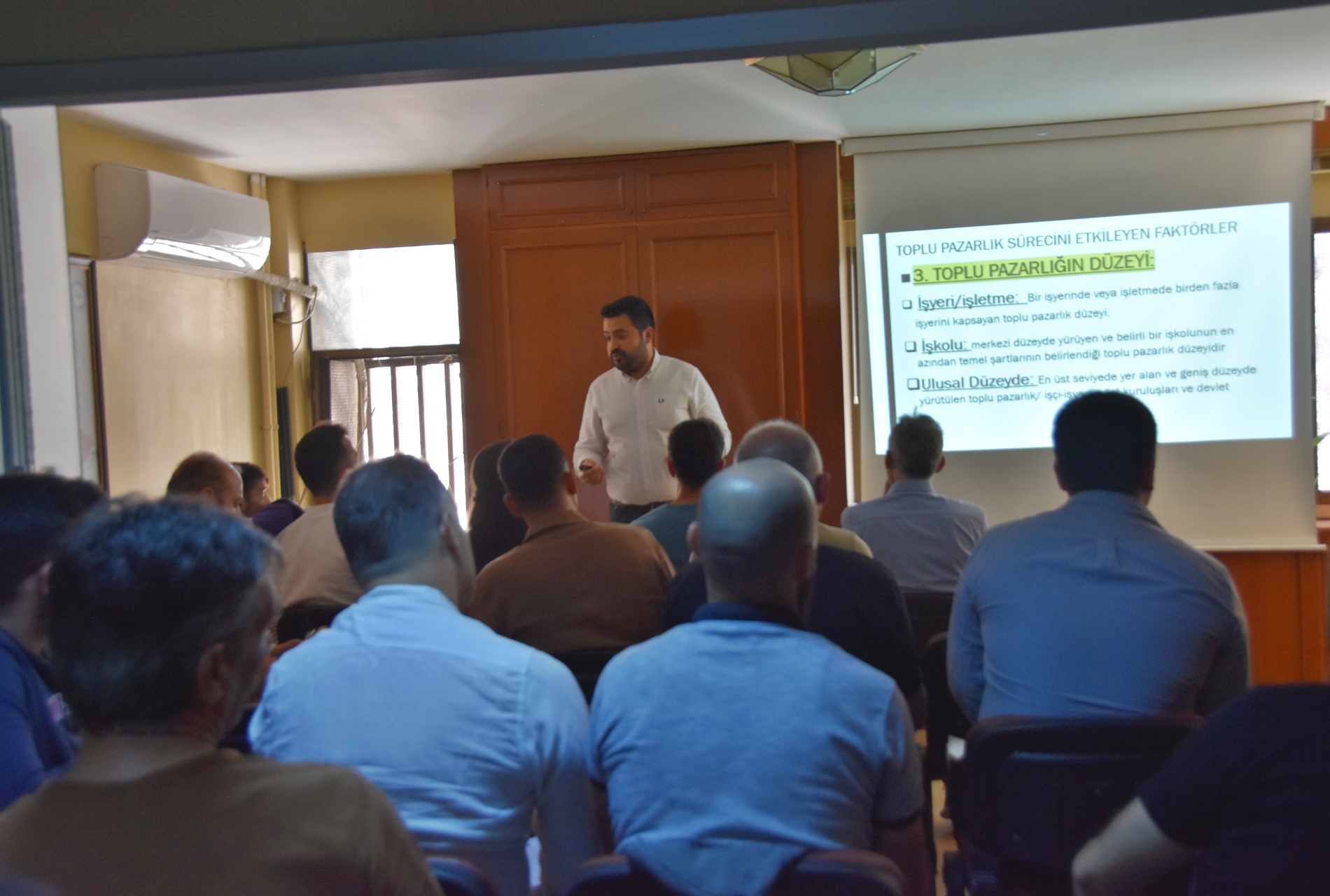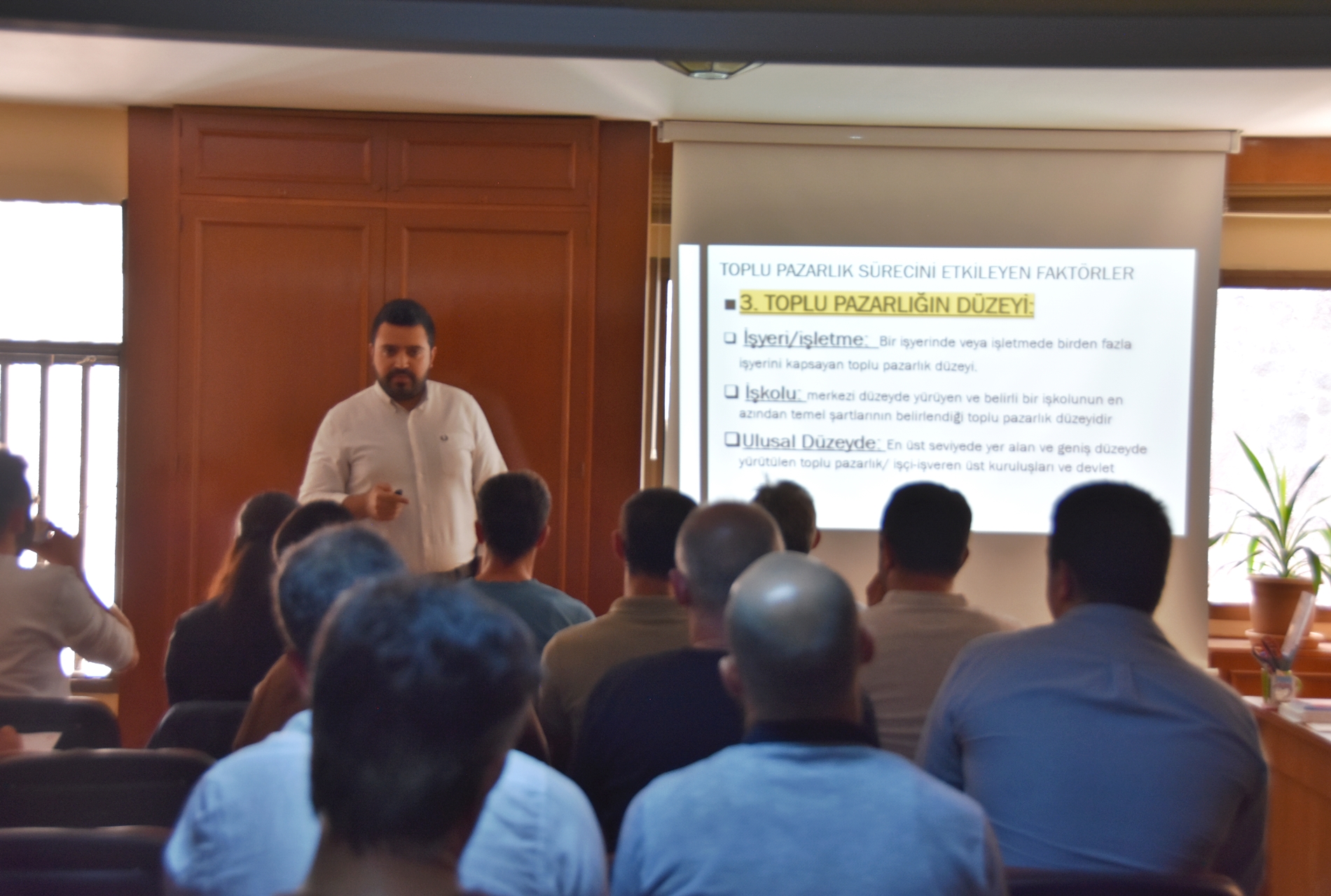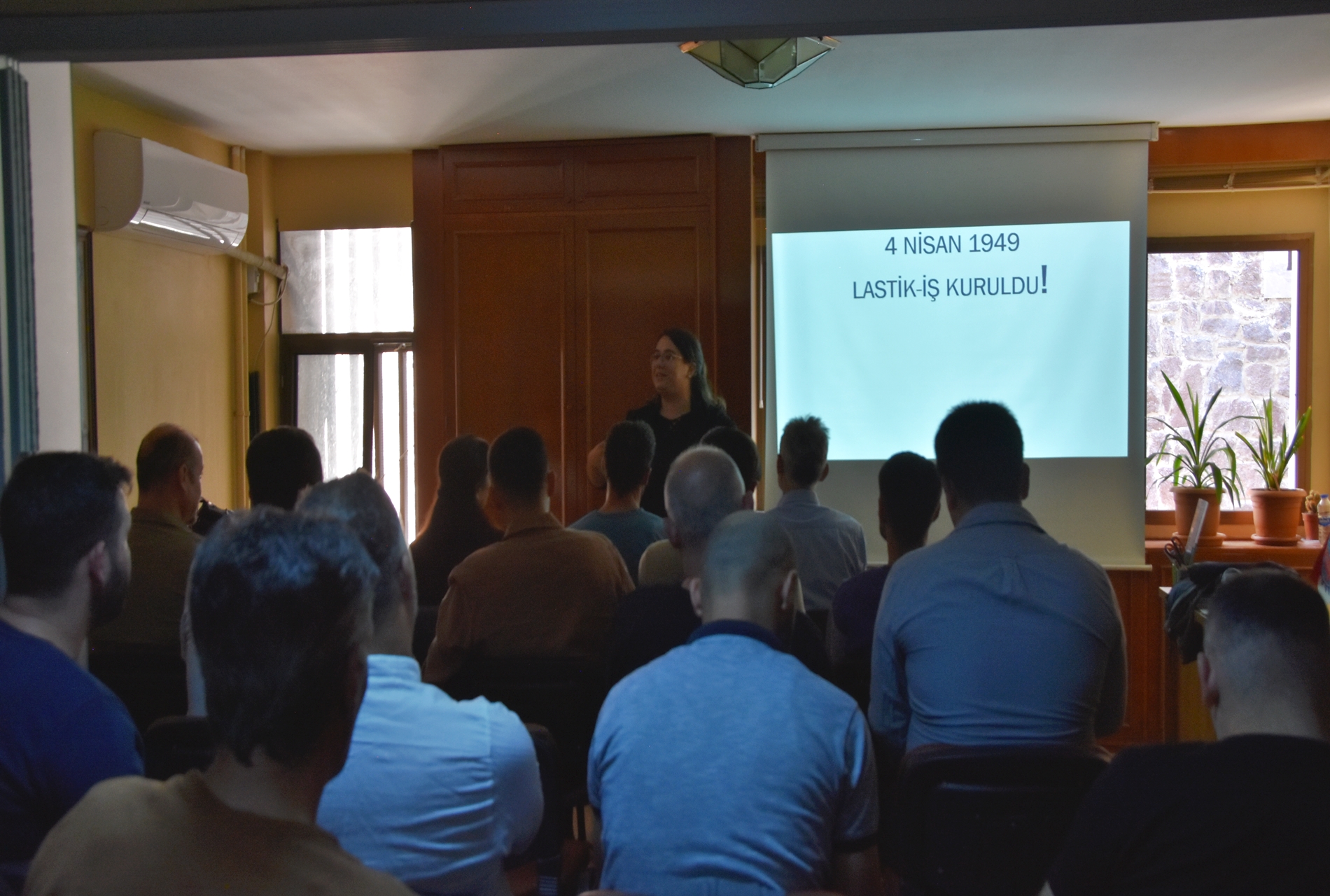 Sendikamızın Toplu Sözleşme ve Eğitim Dairesi Müdürü Üzeyir Ataman’ın ‘‘Türkiye’de Sendikal Hareket ve İşçi Haklarının Gelişimi’’ ve ‘’Enflasyon Ücret İlişkisi ve Ücret Politikaları’’ adlı sunumlarının ardından, Toplu Sözleşme Dairesi Uzmanımız Ece Göktürk ‘‘Lastik-İş’li Olmak’’ adlı sunumunu yaptı. Sendikamızın Avukatı Tolga Demirel’in ‘’Toplu Pazarlık Süreci’’ni işlemesinin ardından eğitim yapılan anket ve sınav uygulaması ile son buldu.