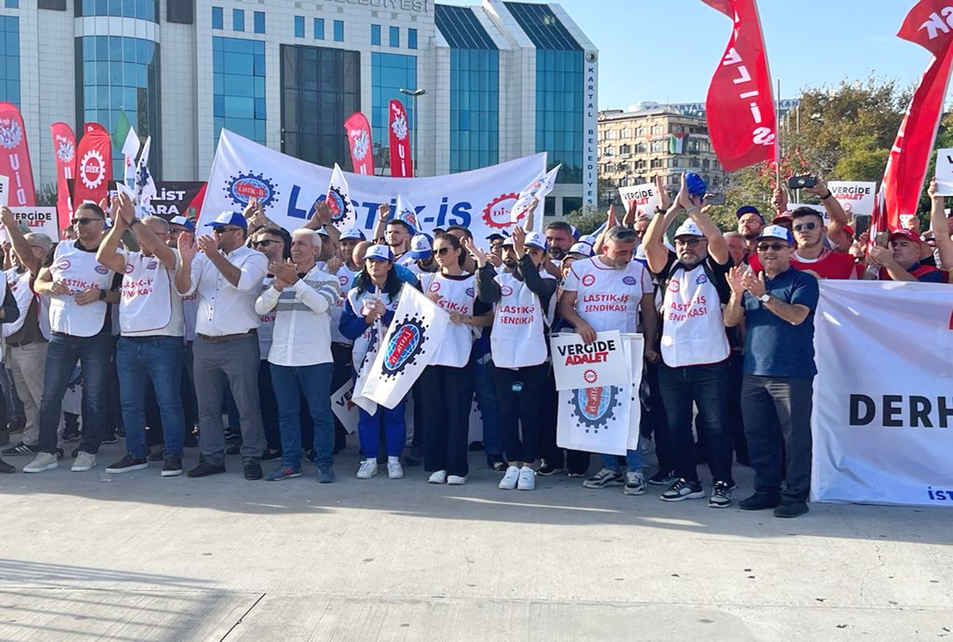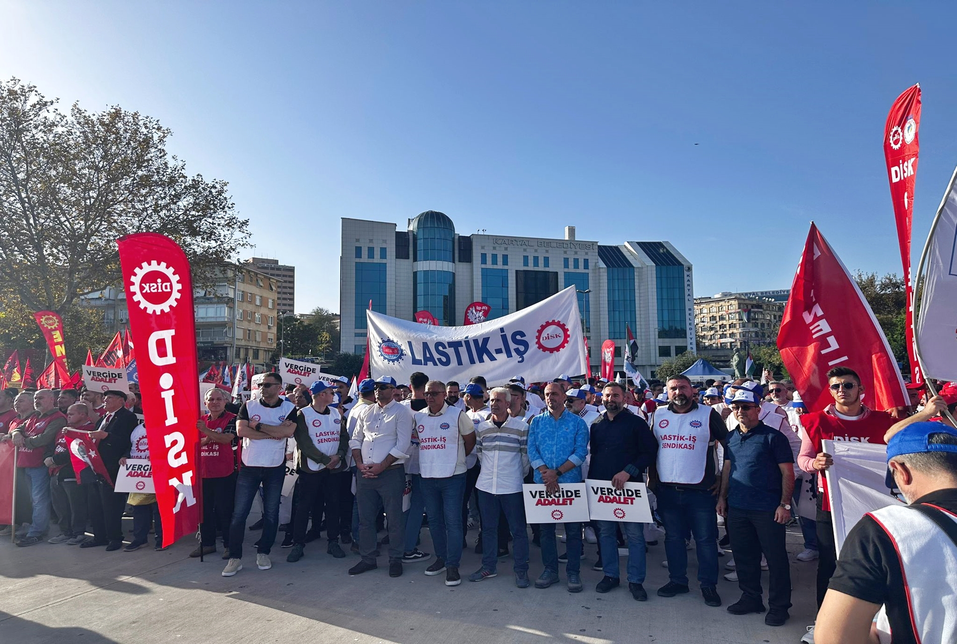 DİSK Genel Başkanı Arzu Çerkezoğlu, DİSK Genel Sekreteri Adnan Serdaroğlu, DİSK Genel Başkan Yardımcısı ve sendikamız Lastik-İş’in Genel Başkanı Alaaddin Sarı, DİSK Genel Başkan Yardımcısı Remzi Çalışkan, Yönetim Kurulu Üyeleri Kazım Doğan ve Seyit Aslan’ın yanı sıra sendikaların yönetici, temsilci ve işçilerin katılımıyla gerçekleşen mitingte basın açıklaması yapıldı. Mitinge sendikamızdan; Genel Başkan Yardımcısı ve Toplu Sözleşme Dairesi Başkanımız Ziya Ünal, Lastik-İş Sendikası Kocaeli, İstanbul, Sakarya ve Gebze Şubeleri yöneticileri, temsilci ve üyelerimiz katıldı.