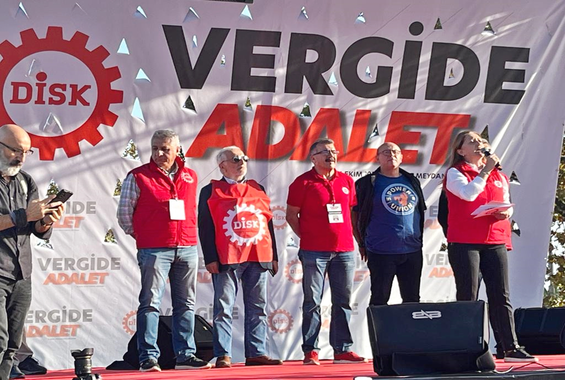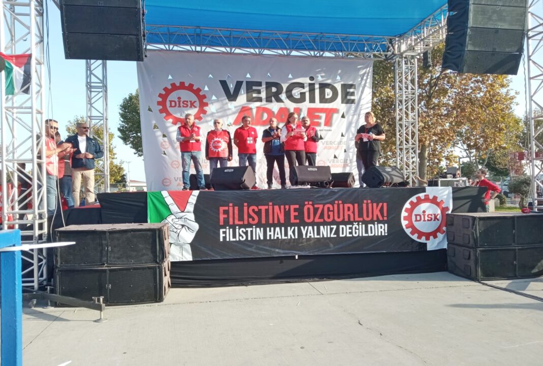 Konfederasyonumuz DİSK’in çağrısıyla 21 Ekim 2023 Cumartesi günü binlerce DİSK’li “Gelirde Adalet, Vergi Adalet” için İstanbul Kartal Meydanı’nda bir araya geldi. DİSK Yönetim Kurulu üyeleri “Filistin’e özgürlük” yazılı pankartla miting alanına geldi.