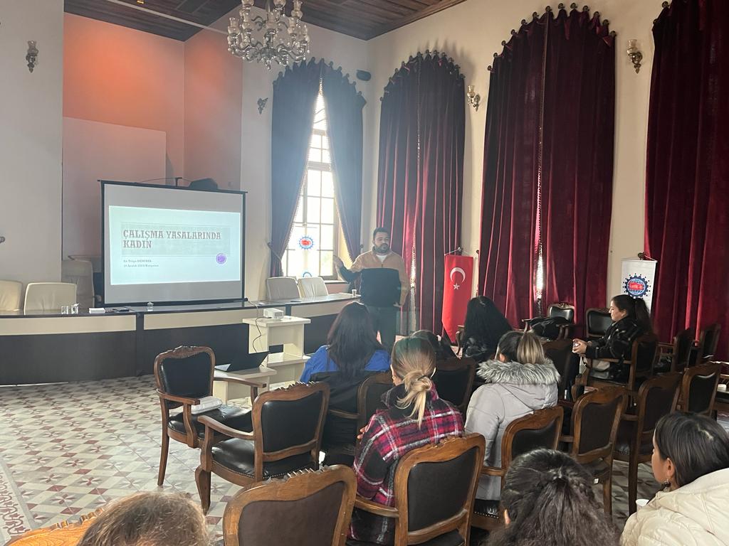 Sendikamızın Toplu Sözleşme ve Eğitim Dairesi Müdürü Üzeyir Ataman ‘’Toplumsal Gelişme ve Sendikal Politikalar’’ sunumu ile eğitime başladı. Toplu Sözleşme Dairesi Uzmanı Ece Göktürk ‘’Eşitlik ve Özgürlük Üzerine’’ sunumu ile devam etti. Ardından Sendikamızın avukatı Tolga Demirel ‘’Çalışma Yasalarında Kadın’’ sunumu ile eğitim programını tamamladı. Eğitimlere katılan üyelerimiz ile karşılıklı soru-cevap ve değerlendirmelerin ardından anket çalışması ile eğitim sona erdi.