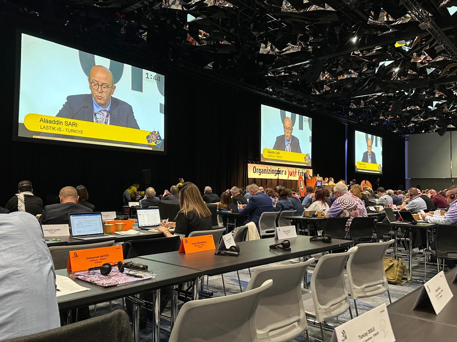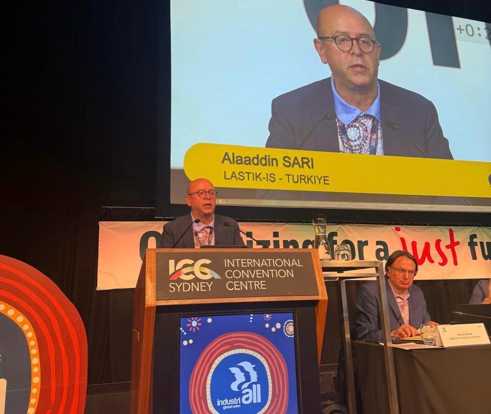 Genel Başkanımız Alaaddin Sarı, IndustriALL Küresel Sendika’nın Dördüncü Olağan Genel Kurulu’nda iki ayrı konuşma yaptı. İlk konuşmasında, Türkiye işçi hareketinin sorunlarını ve sendikal mücadelenin önemini dile getirerek, demokrasi ve işçi hakları mücadelesinin birbirinden ayrılamayacağını vurguladı. Eşitsizliklere ve adaletsizliklere karşı sesimizi yükseltirken, aslında demokrasiyi savunuyoruz” diyen Genel Başkanımız, sendikal özgürlüklerin kısıtlandığı bir dünyada “insanca yaşamdan söz etmenin mümkün olmadığını” ifade etti.