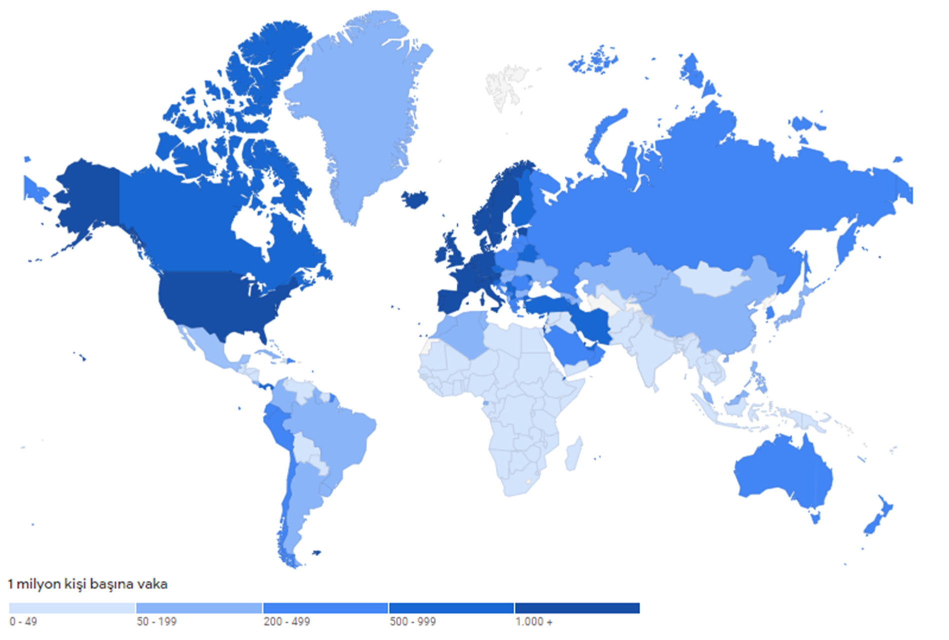 Yeni tip koronavirüsün en fazla görüldüğü ülke 684.920 vakayla ABD olurken, sırayı 188.093 vakayla İspanya, 172.434 vakayla İtalya, 147.121 vakayla Fransa, 139.134 vakayla Almanya ve 109.769 vakayla İngiltere takip ediyor.