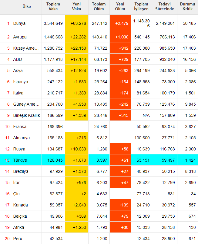 COVID-19 nedeniyle dünya genelinde ölüm oranı %7‘ye çıkmış durumda bulunuyor. İspanya, İtalya, Fransa, İngiltere, Belçika, Hollanda, İsveç, Cezayir ve Macaristan‘da ölüm oranının %10’un üzerinde olduğu görülüyor. Dünyadaki farklı ülkelerden günlük olarak çok sayıda yeni vaka bildiriliyor. 3 Mayıs itibarıyla dünya genelinde COVID-19 nedeniyle hayatını kaybedenlerin sayısı 247 bin oldu. Şu ana kadar tespit edilen 3 milyon 558 bin vakadan, 1 milyon 150 bin kişi tedavi edildi ve iyileşme oranı %32,3 oldu.