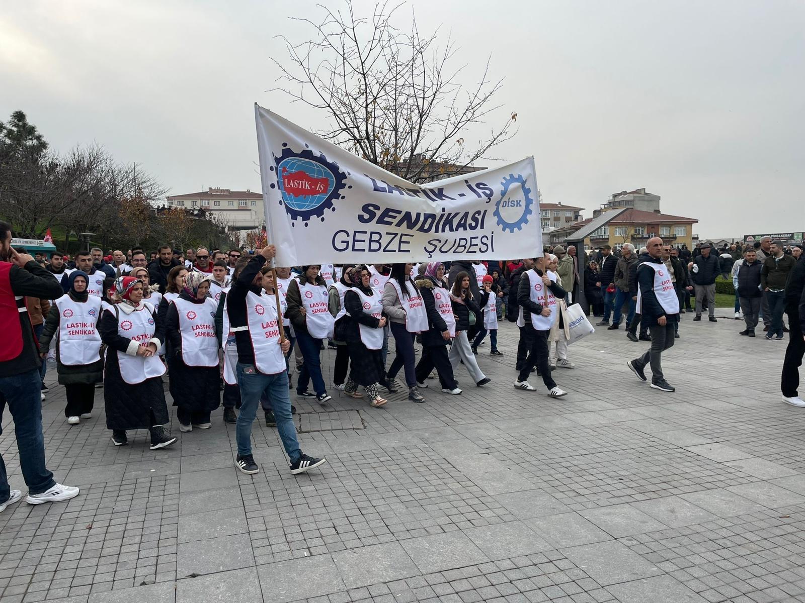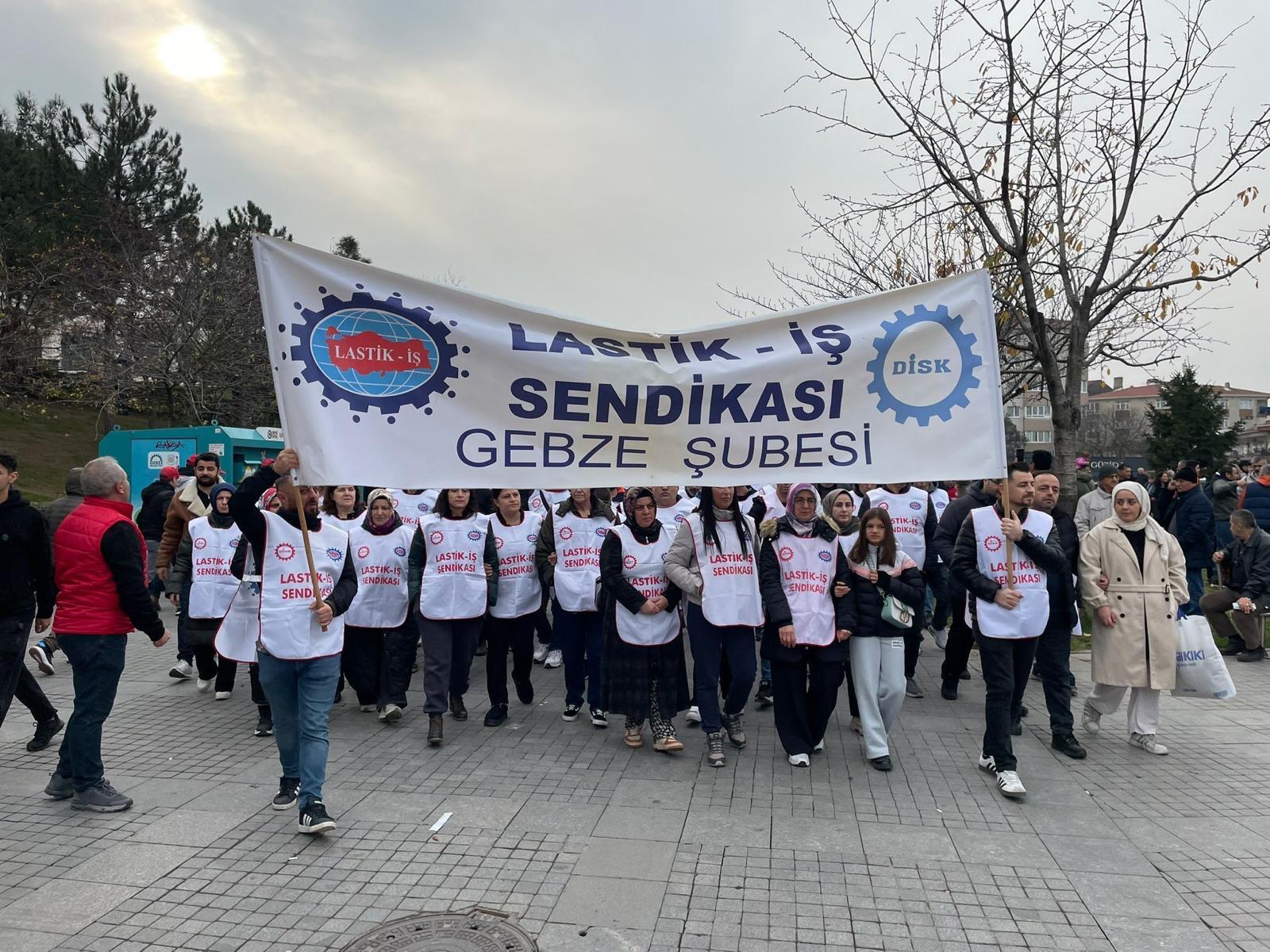 DİSK Yönetim Kurulu üyeleri ve sendikaların yoğun katılımıyla oluşturulan yürüyüş korteji Gebze Trafo Meydanı’ndaki coşkulu karşılamanın ardından mitingin yapılacağı Gebze Kent Meydanı’na doğru harekete geçti. İşçi kenti Gebze’de yol boyunca vatandaşlar yürüyüşçülere alkışlarla, kornalarla destek verdi.